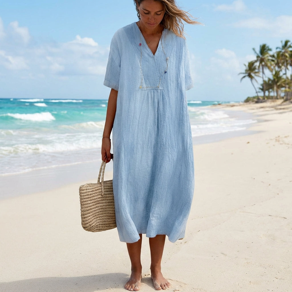 A breezy summer dress in an airy blend of organic cotton and linen, designed to keep you cool from brunch to late-sunset walks. The fitted bodice and softly flared skirt create an easy, feminine silhouette that moves with you.